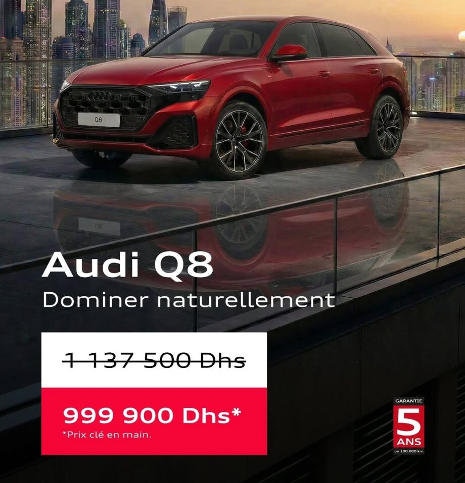 - Dominez naturellement la route avec l’Audi Q8. Ce SUV de luxe affiche un prix exceptionnel de 999 900 DH ‘clé en main’ au lieu de 1 137 500 DH. Profitez également d’une tranquillité d’esprit totale grâce à une garantie de 5 ans ou 100 000 km. Un véhicule qui allie puissance, prestige et confort premium.