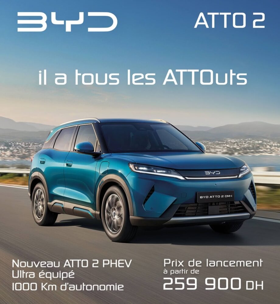 - Le nouveau BYD Atto 2 PHEV (Hybride Rechargeable) arrive avec tous les ‘ATTOuts’ pour vous séduire. Ultra équipé et offrant jusqu’à 1000 km d’autonomie combinée, ce SUV innovant est proposé à un prix de lancement exceptionnel de 259 900 DH. Passez à la mobilité durable sans compromis sur la puissance ou le confort.