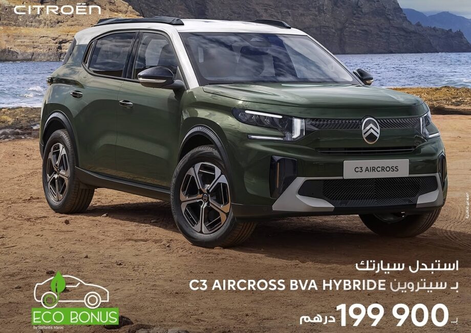- Découvrez la nouvelle Citroën C3 Aircross avec boîte de vitesse automatique et motorisation hybride. Grâce à l’offre Eco Bonus par Stellantis Maroc, remplacez votre ancienne voiture et profitez de ce SUV compact et polyvalent à un prix très compétitif. Idéal pour la ville comme pour les escapades en plein air.
