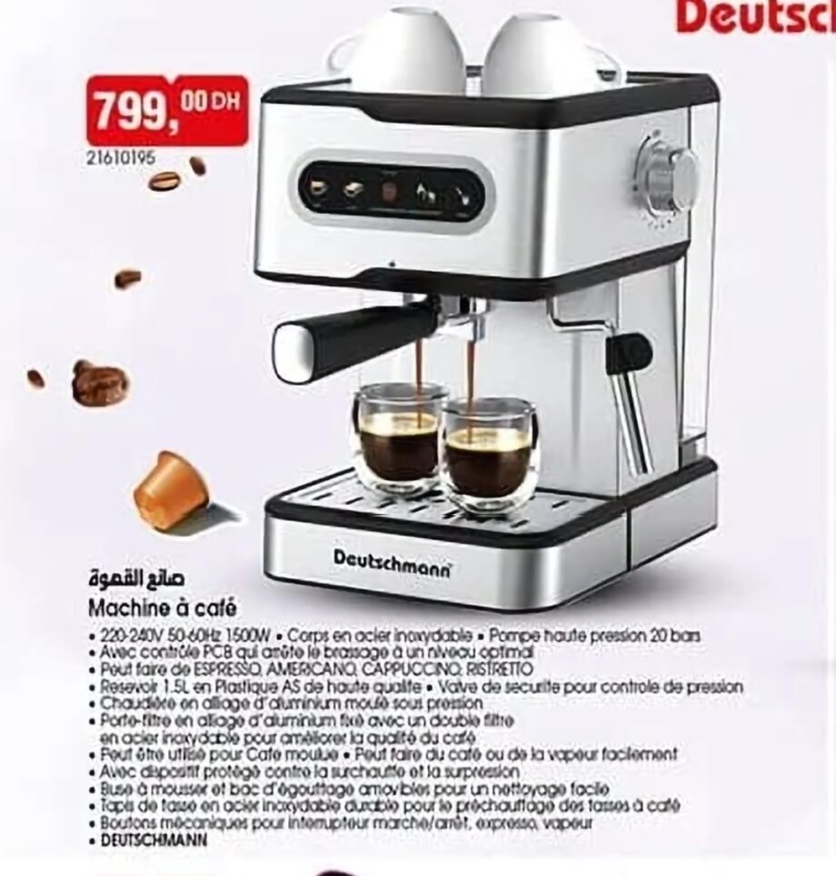 - آلة تحضير القهوة إكسبريسو من Deutschmann بقوة 1500 واط وهيكل من الفولاذ المقاوم للصدأ (إينوكس). تتميز بمضخة ضغط عالي تصل إلى 20 بار لضمان جودة القهوة. يمكنها تحضير أنواع مختلفة مثل الإكسبريسو، الأمريكانو، والكابتشينو باستخدام القهوة المطحونة. تحتوي على خزان ماء سعة 1.5 لتر، فوهة لتبخير الحليب، وسطح لتسخين الفناجين.