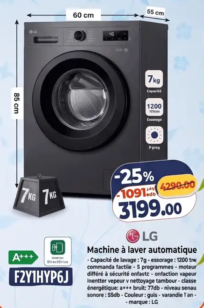 1. Lave-linge frontal LG (Modèle F2Y1HYP6J) avec une capacité de 7kg et une vitesse d’essorage de 1200 tr/min. Équipé du moteur Inverter DirectDrive pour plus de silence et de durabilité. Classe énergétique A+++. Dimensions : 60cm de largeur, 85cm de hauteur et 55cm de profondeur. Comprend des fonctions vapeur et nettoyage du tambour. Réduction massive de 25% (économie de 1091 DH) sur le prix initial de 4290.00 DH.