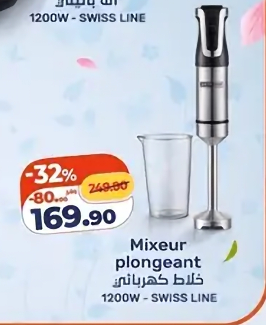 - Mixeur plongeant haute puissance de 1200W de la marque SWISS LINE. Idéal pour préparer des soupes, sauces et smoothies directement dans vos récipients. Vendu avec un verre doseur transparent. Corps robuste avec finition en acier inoxydable. Réduction de 32% par rapport au prix original de 249.90 DH.