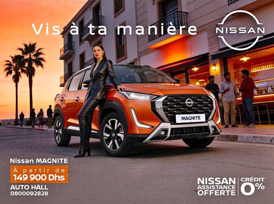 - Vivez à votre manière avec le Nissan Magnite. Ce SUV compact et robuste est proposé à partir de 149 900 DH chez Auto Hall. Profitez d’offres exceptionnelles incluant l’assistance Nissan offerte et une option de crédit à 0%. C’est le moment idéal pour choisir un véhicule qui allie style urbain et technologies modernes.