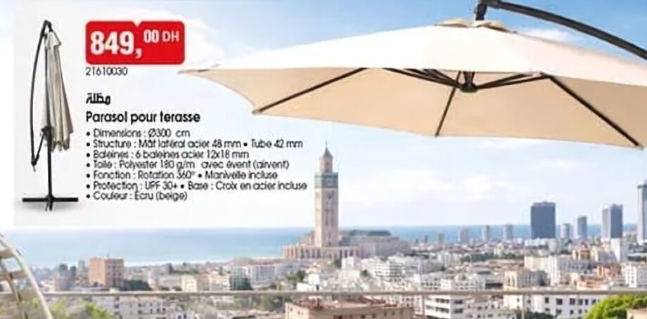 - مظلة خارجية (Parasol) مثالية للشرفات والحدائق بقطر 300 سم. تتميز بهيكل قوي بقطب جانبي من الفولاذ (48 ملم) و6 دعامات فولاذية. غطاء المظلة مصنوع من البوليستر بكثافة 180 غرام/متر مربع مع فتحة تهوية. توفر خاصية الدوران 360 درجة مع كرنك يدوي متضمن لسهولة الفتح والإغلاق، وحماية من الشمس UPF 30+. متوفرة باللون البيج وتشمل قاعدة متقاطعة.