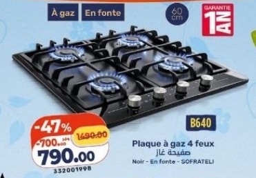 - موقد غاز بأربع عيون مع سطح من الحديد المصبوب يوفر متانة عالية. يسمح بطهي سريع ومتجانس بفضل الشعلات القوية. تصميم أنيق ينسجم مع مختلف المطابخ. مفاتيح أمامية سهلة الاستخدام للتحكم الدقيق في درجة اللهب. مناسب للاستعمال اليومي مع مختلف أواني الطهي.