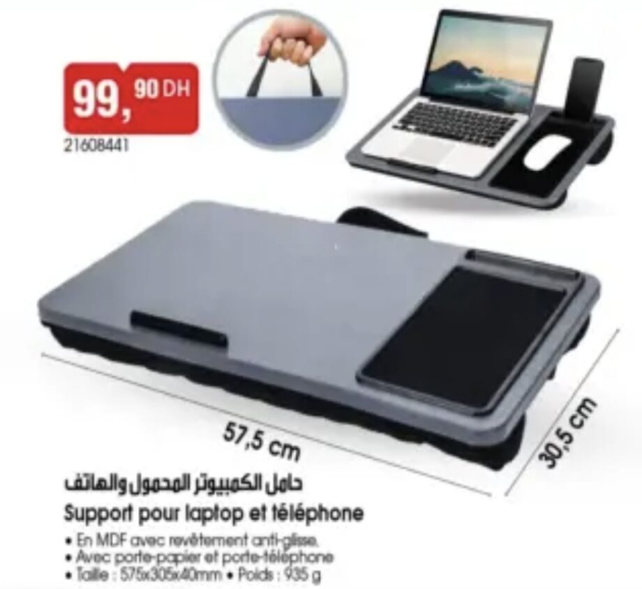 - Optimisez votre espace de travail avec ce support ergonomique pour ordinateur portable et téléphone, disponible en solde. Conçu en MDF avec un revêtement anti-glisse, il inclut un porte-papier et un emplacement dédié pour votre smartphone. Dimensions de 57,5 x 30,5 cm, idéal pour travailler confortablement depuis votre canapé ou votre lit.