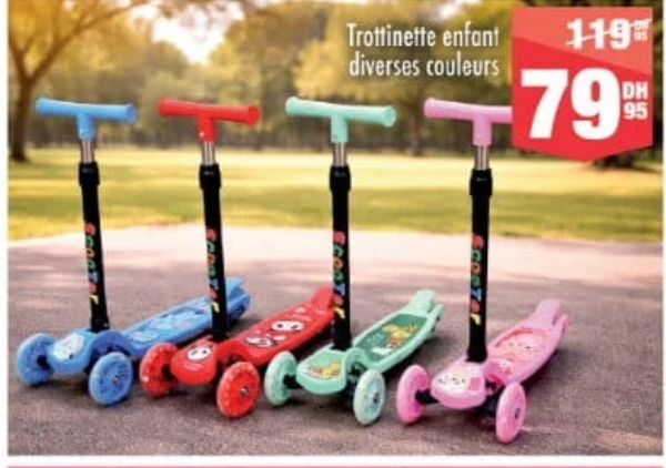 - Trottinette pour enfant équipée de trois roues pour plus de stabilité et de sécurité. Idéale pour les premières expériences de glisse, elle permet aux enfants d’améliorer leur équilibre et coordination. Guidon ergonomique adapté aux petites mains avec plateforme antidérapante. Structure légère mais robuste pour une utilisation en extérieur comme dans les parcs ou trottoirs. Facile à transporter et disponible en plusieurs couleurs attrayantes pour les enfants.