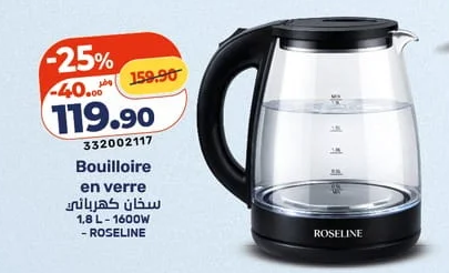 Posted in Électroménager Bouilloire en verre ROSELINE – سخان كهربائي Kazyon 119.90 DH 12 avril 2026 Bouilloire électrique en verre transparent d’une capacité de 1,8 litre. Puissance de 1500W pour une ébullition rapide. غلاية كهربائية من الزجاج الشفاف بسعة 1.8 لتر . تعمل بقدرة 1500 واط لضمان غليان سريع للماء. Kazyon 119.90 DH Autres Promos:Aspirateur Bosch 20V Noir - مكنسة بوش 20 فولت أسود Electroplanet 1599 DHAspirateur Elexia 21.6V Gris - مكنسة إليكسيا 21.6 فولت رمادي Electroplanet 799 DH