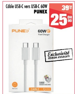 Câble USB-C vers USB-C 60W PUNEX – كابل يو إس بي سي Aswak Assalam 25.90 DH