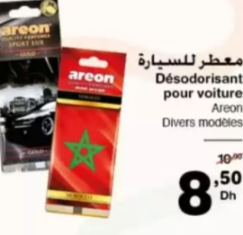 Posted in Auto Désodorisant pour voiture Areon – معطر للسيارة Carrefour 8.50 DH 13 avril 2026 Parfums d’ambiance Areon pour voiture. Divers modèles et senteurs disponibles. معطر جو للسيارة Areon . متوفر بموديلات وروائح متنوعة. Carrefour 8.50 DH Autres Promos:Nettoyant multi-action Motul 200ml - منظف للسيارات Carrefour 89.90 DHLave-glace Gacc 1L / 5L - منظف زجاج السيارة Carrefour 19.90 DH