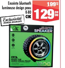 Posted in Audio Enceinte bluetooth lumineuse pneu K-80 – مكبر صوت بلوتوث Aswak Assalam 129.00 DH 12 avril 2026 Enceinte sans fil Bluetooth au design original en forme de pneu avec effets lumineux LED. Modèle K-80 CIK. مكبر صوت بلوتوث لاسلكي بتصميم مميز على شكل إطار سيارة مع إضاءة ليد ملونة. موديل K-80 من ماركة CIK. Aswak Assalam 129.00 DH Autres Promos:Ecouteurs filaires USB-C K-E209C - سماعات أذن Aswak Assalam 39.00 DH