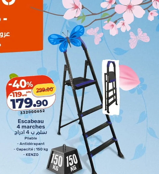 Posted in Bricolage Escabeau 4 marches – سلم بـ 4 أدراج Kazyon 179.90 DH 13 avril 2026 Escabeau pliable de la marque KENZ avec 4 marches. Pieds antidérapants et capacité de charge maximale de 150 kg. سلم قابل للطي من ماركة KENZ بـ 4 درجات . أرجل مضادة للانزلاق وتحمل أقصى يصل إلى 150 كجم . Kazyon 179.90 DH Autres Promos:Piles Eveready AA / AAA - بطاريات Carrefour 45.00 DHVisseuse électrique - مفك كهربائي Kazyon 199.00 DH
