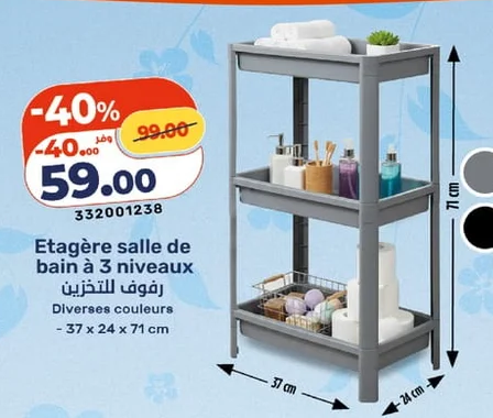 Posted in Maison Etagère salle de bain à 3 niveaux – رفوف للتخزين Kazyon 59.00 DH 13 avril 2026 Etagère de rangement pour salle de bain à 3 niveaux. Dimensions 37 x 24 x 71 cm. Diverses couleurs disponibles. رفوف للتخزين للحمام مكونة من 3 مستويات . الأبعاد 37 × 24 × 71 سم . متوفرة بألوان متنوعة. Kazyon 59.00 DH Autres Promos:Meuble de coin pour salle de bain - رف تخزين للحمام Kazyon 99.00 DHMini aspirateur - مكنسة كهربائية صغيرة Kazyon 52.90 DH
