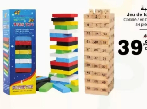 Posted in Jouets Jeu de tour coloré en bois – لعبة Carrefour 39.90 DH 13 avril 2026 Jeu de tour en bois coloré comprenant 54 pièces pour toute la famille. Favorise l’adresse et la réflexion. لعبة برج خشبية ملونة تتكون من 54 قطعة لجميع أفراد العائلة . تعزز المهارة والتركيز. Carrefour 39.90 DH Autres Promos:Voiture Fierce RC Zoko-SW - لعبة Carrefour 139.90 DHSac à dos médecin Zoko-Fazconta - لعبة Carrefour 149.90 DH