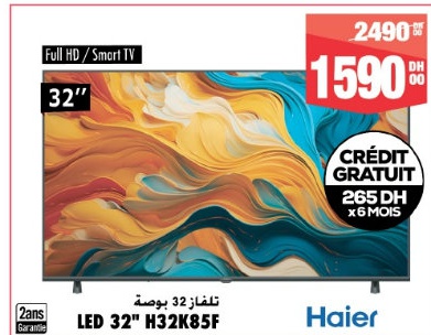 • Téléviseur Haier 32 pouces LED, Full HD Smart TV. Offre crédit gratuit à 265 DH par mois sur 6 mois. Garantie 2 ans.