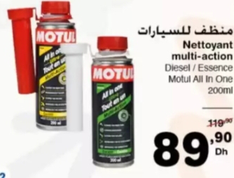 Posted in Auto Nettoyant multi-action Motul 200ml – منظف للسيارات Carrefour 89.90 DH 13 avril 2026 Nettoyant injecteurs et système d’alimentation multi-action pour moteurs Diesel ou Essence. منظف متعدد المفعول لنظام الوقود والمحركات سواء كانت ديزل أو بنزين. Carrefour 89.90 DH Autres Promos:Lave-glace Gacc 1L / 5L - منظف زجاج السيارة Carrefour 19.90 DHDésodorisant pour voiture Areon - معطر للسيارة Carrefour 8.50 DH