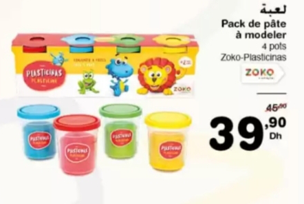 Posted in Jouets Pack de pâte à modeler Zoko-Plasticinas – لعبة Carrefour 39.90 DH 13 avril 2026 Pack comprenant 4 pots de pâte à modeler de couleurs différentes de la marque ZOKO. مجموعة عجين اللعب تضم 4 علب بألوان مختلفة من ماركة ZOKO . Carrefour 39.90 DH Autres Promos:Voiture Fierce RC Zoko-SW - لعبة Carrefour 139.90 DHSac à dos médecin Zoko-Fazconta - لعبة Carrefour 149.90 DH