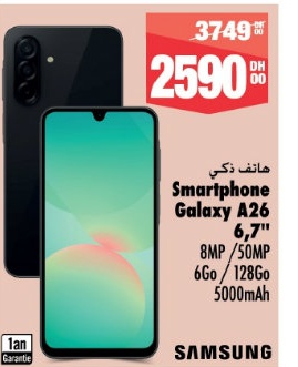 - Samsung Galaxy A26 performant avec écran 6,7 pouces. Dispose de 6Go de RAM, 128Go de stockage interne, caméra 50MP et batterie longue durée 5000mAh. Garantie 1 an.