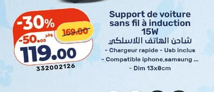 Posted in Auto Support de voiture sans fil à induction 15W – شاحن الهاتف اللاسلكي Kazyon 119.00 DH 13 avril 2026 Support voiture avec chargeur rapide sans fil 15W. Compatible avec iPhone et Samsung. Dimensions 13 x 8 cm. حامل هاتف للسيارة مع شاحن لاسلكي سريع بقوة 15 واط . متوافق مع هواتف أيفون وسامسونج. الأبعاد 13 × 8 سم . Kazyon 119.00 DH Autres Promos:Lave-glace Gacc 1L / 5L - منظف زجاج السيارة Carrefour 19.90 DHDésodorisant pour voiture Areon - معطر للسيارة Carrefour 8.50 DH